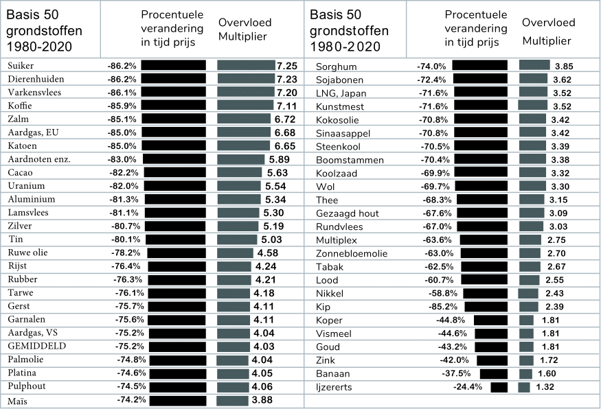 Hoewel grondstofprijzen kunnen stijgen in nationale valuta en dat meestal ook doen, is dat het gevolg van de devaluatie van nationale valuta. Gemeten aan de loonkosten, of de prijs van menselijke tijd, dalen de prijzen van alle grondstoffen op de lange termijn, zelfs als de consumptie gestaag toeneemt. In een wereld met hard geld, zoals onder de goudstandaard, zou het volkomen normaal zijn om te verwachten dat de prijzen van alle grondstoffen in de loop van de tijd consequent dalen, met slechts af en toe een tijdelijke stijging door scherpe, plotselinge stijgingen van de vraag en de verstoringen van de productie. Goud, of wat er ook als geld wordt gebruikt, zou altijd het goed zijn waarvan het aanbod het langzaamst toeneemt, waardoor de eigenaars ervan er voor altijd meer van alle andere goederen kunnen krijgen, waarvan het aanbod sneller toeneemt.
