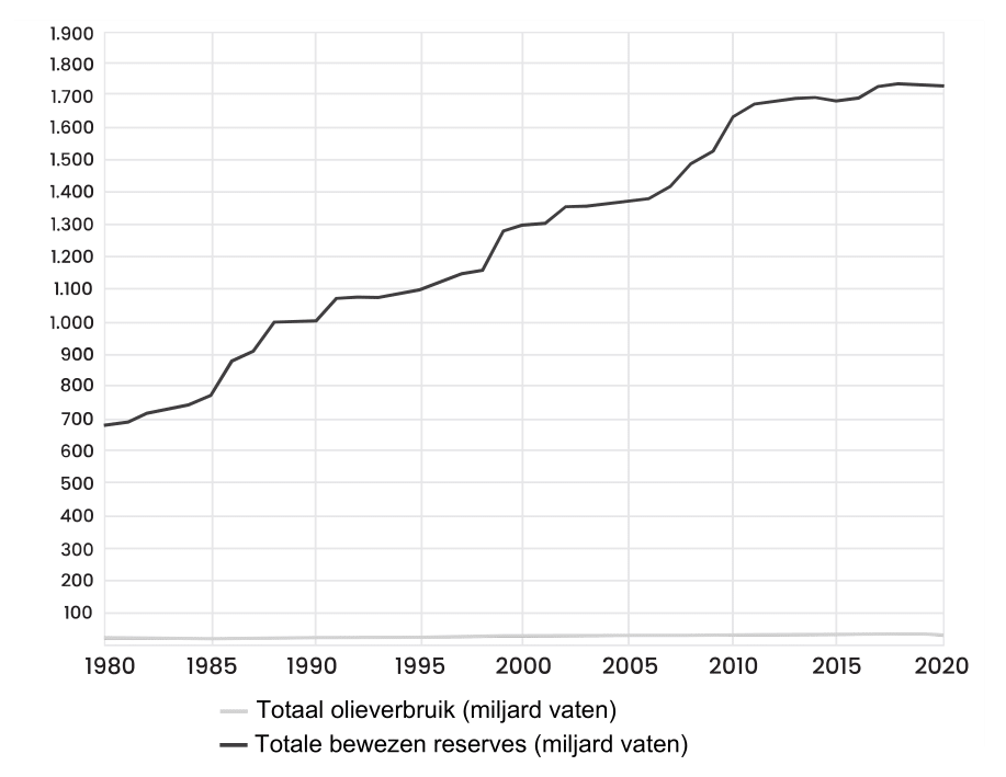 Olie, het onmisbare smeermiddel van moderne economieën, is het beste voorbeeld omdat er vrij betrouwbare statistieken voor zijn. Zoals Figuur 3.4 laat zien, blijven het olieverbruik en de olieproductie van jaar tot jaar stijgen, terwijl de bewezen reserves nog sneller toenemen. Volgens gegevens van BP’s Statistical Review of World Energy lag de jaarlijkse olieproductie in 2015 46% hoger dan in 1980, terwijl het verbruik 55% hoger lag. De oliereserves daarentegen zijn met 148% toegenomen, ongeveer het drievoudige van de toename in productie en verbruik.