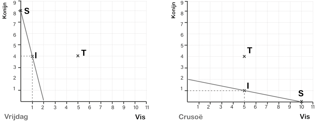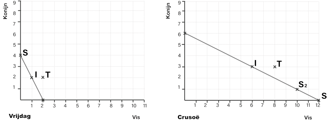 De ruiltransactie laat Vrijdag inzien dat de beste manier om aan vis te komen is om op konijnen te jagen en die te ruilen voor vis, terwijl Crusoë zich realiseert dat hij meer konijnen kan krijgen door te vissen en de vis te ruilen voor konijnen dan door op konijnen te jagen. Het eindresultaat is dat het logisch is dat ze zich specialiseren in de goederen die ze goedkoper kunnen produceren. Als ze zich specialiseren, en Crusoë alleen vis en Vrijdag alleen konijnen vangt, zoals weergegeven in punt S in Figuur 9.1, dan zou hun gezamenlijke dagelijkse productie 8 konijnen en 10 vissen zijn, wat 3 konijnen en 4 vissen meer is dan ze zouden hebben gehad als ze vijanden waren gebleven. Als ze hun oogst in tweeën delen, krijgen ze elk 4 konijnen en 5 vissen, zoals te zien is in punt T.