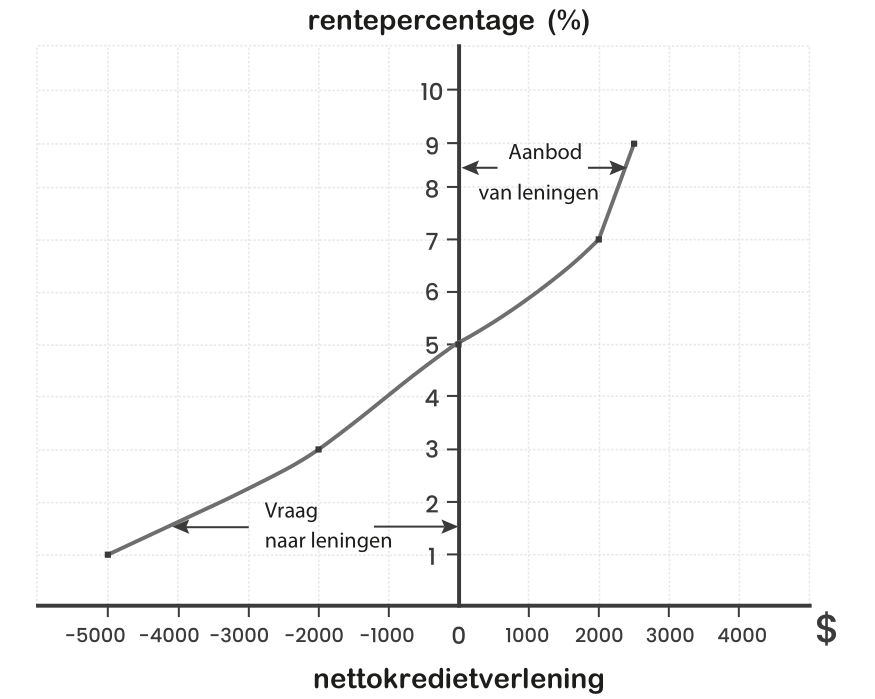 We kunnen deze relatie grafisch weergeven: elk individu heeft een ‘tijdmarktcurve’, die bepaalt hoeveel geld ze zou willen lenen of uitlenen tegen een gegeven rentevoet. Voor een spaarder met een jaarlijks disconto voor de toekomst van 5%, zorgt een marktrente van 5% ervoor dat ze niet wil lenen of uitlenen, omdat de markt hetzelfde disconto heeft. Als de marktrente tot 7% zou stijgen, wordt haar nu een verleidelijke kans geboden: als ze vandaag afziet van het genot van een bepaald geldbedrag, kan ze dit geld uitlenen en het over een jaar ontvangen met een rente van 7%. Aangezien ze het toekomstige geld verdisconteert tegen een rente van 5%, zou deze lening haar een rendement van 2% opleveren. Als de rente daarentegen zou dalen tot 3%, dan zou ze geneigd zijn om te lenen op de kapitaalmarkt. Lenen tegen 3% betekent dat ze in een jaar 103% van de hoofdsom moet terugbetalen, en omdat ze de toekomst verdisconteert tegen 5%, is haar terugbetaling lager dan de waarde die ze vandaag aan de lening toekent. Als de rente stijgt, neemt de vraag naar leningen natuurlijk af, terwijl de vraag naar uitlenen toeneemt.